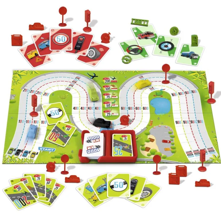 1000 KM es un juego de mesa en que el objetivo principal es llegar a la meta de los 1000 KM ¡Tendrás que prestar atención a tus oponentes! Podrías quedarte sin combustible, pinchar una rueda o tener un cliente… ¡Saltarte un semáforo rojo te retrasará! Recoge las cartas para defenderte o incluso volverte invencible hasta la línea de meta. En el interior encontrarás todos los accesorios para jugar. Contiene 110 cartas, un dispensador de cartas, un tableo, 4 peones de coche, 17 peones de ataque, 4 piezas de protección y las instrucciones de juego. De 2 a 4 jugadores. Recomendado a partir de 5 años.