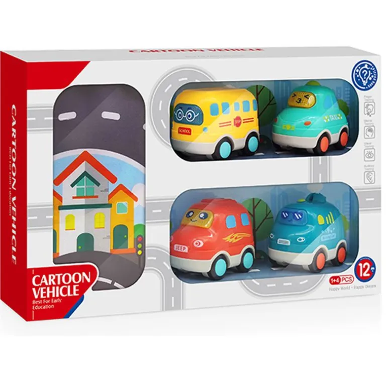 Alfombra infantil con asas para que puedas llevarla contigo a todas partes acompañada de 4 vehículos que reproducen luces y sonidos.