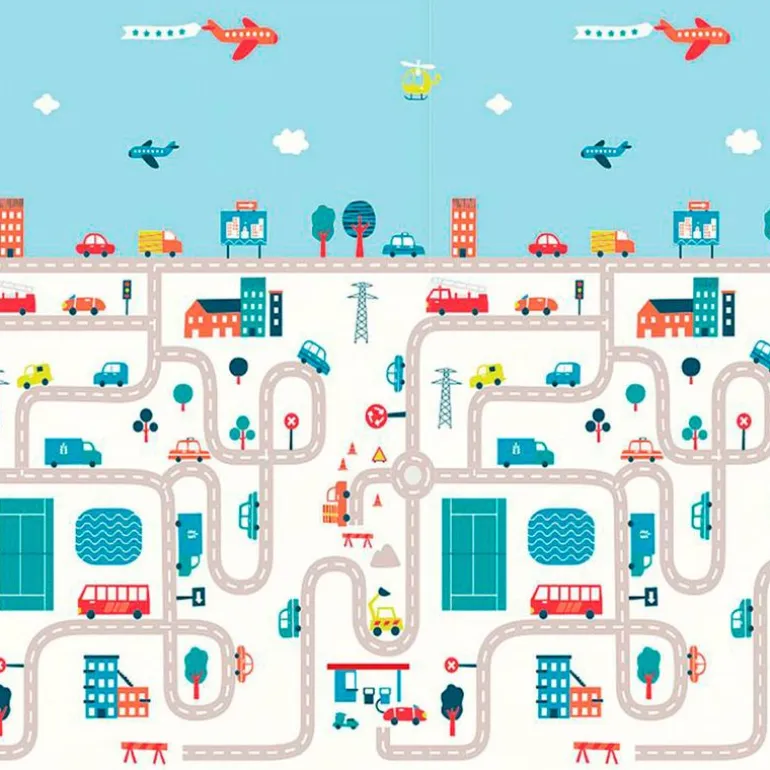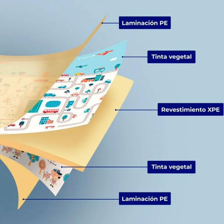 Alfombra de juegos reversible XXL de espuma de alta densidad, que proporciona un espacio divertido, seguro y estimulante, para ayudar a fomentar el gateo en el bebé.Reversible en 2 ilustraciones, en uno de los laterales tiene una ciudad dibujada con una carretera y en el otro lateral tiene divertidos y coloridos dibujos para ayudar a la estimulación visual del bebe.