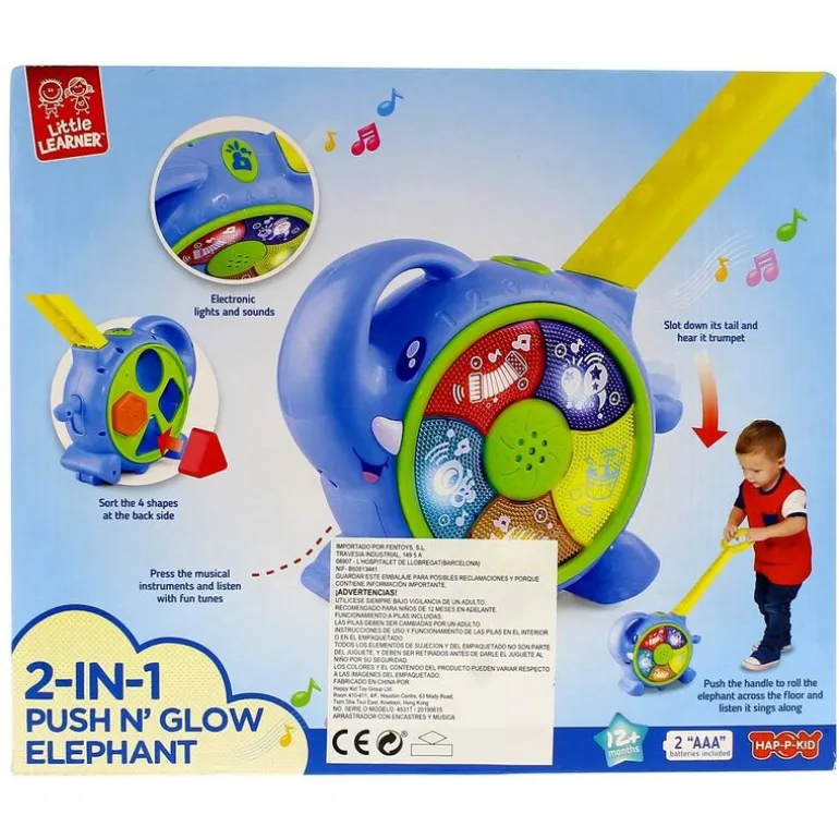 Arrastrador infantil en forma de elefante que reproduce música y dispone de encastres para que puedas introducir bloques de diferentes formas.