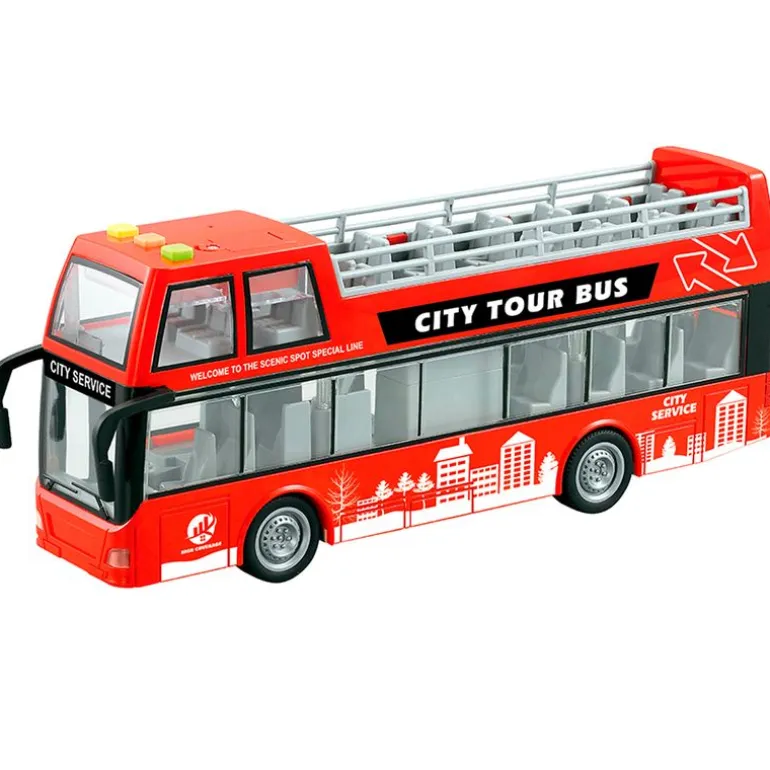 Autobús turístico con una escala de 1:16. Funciona como si fuera de verdad gracias a su sistema de carga por retroceso. Reproduce luces y sonidos. Funciona con pilas incluidas (pilas de demostración). Recomendado a partir de 3 años.