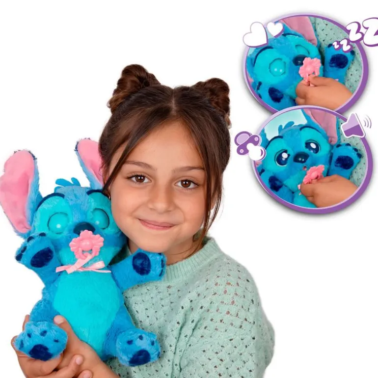Adorable Stitch de la colección Baby Paws ¡Abre sus ojitos! Si le quitas le chupete se despertará abriendo sus ojitos y si se lo quitas los cerrará quedándose dormidito.