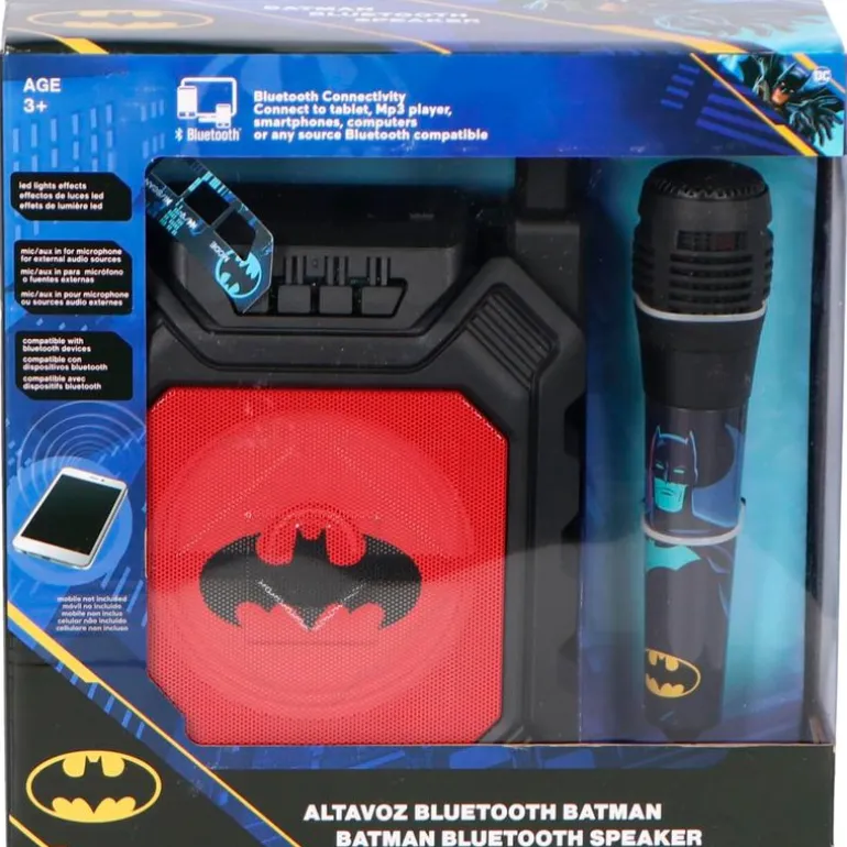 Altavoz con micrófono con diseños inspirados en el superhéroe Batman.