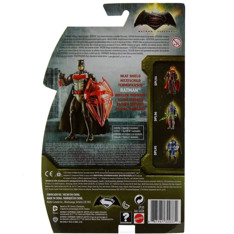 Figura de Batman con escudo térmico de DC Comics, con un diseño muy realista y detalles inspirados en el personaje del film Batman vs Superman, Dawn of Justice. La figura de Batman cuenta con 9 puntos de articulación, incluye un escudo térmico que utiliza como arma defensa personal y mide, aproximadamente, 15 cm. Recrea las emocionantes batallas de la película Batman vs Superman con todas las figuras de la colección de DC Comics (SE VENDEN POR SEPARADO).