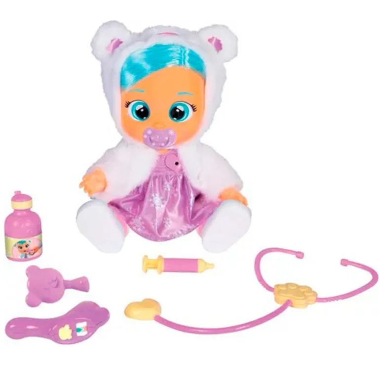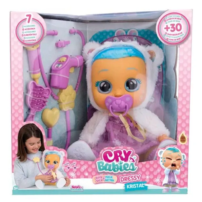 Kristal está malita de la colección Bebés Llorones Dressy ¡Ahora lleva ropita de verdad y zapatos a juego! Cuando le quitas el chupete llora lágrimas de verdad y reproduce sonidos reales. Kristal está malita y tendrás que cuidarla, deberás darle la medicina y muchos mimos para que se sienta mejor y deje de llorar. Si se resfría deberás darle la medicina para que deje de toser. Si llora como si estuviese malita, deberás usar el termómetro para comprobar si tiene fiebre ¡Quizás tiene varicela! Le aparecerás manchitas rojas en la cara, pero cuando le pongas la vacuna… ¡Desaparecerán! Reproduce 30 sonidos diferentes y viene acompañada de accesorios. Contiene un chupete, un fonendoscopio, jarabe, una inyección, un termómetro y una mascarilla. Funciona con 3 pilas LR6 incluidas (pilas de demostración). Recomendado a partir de 3 años.