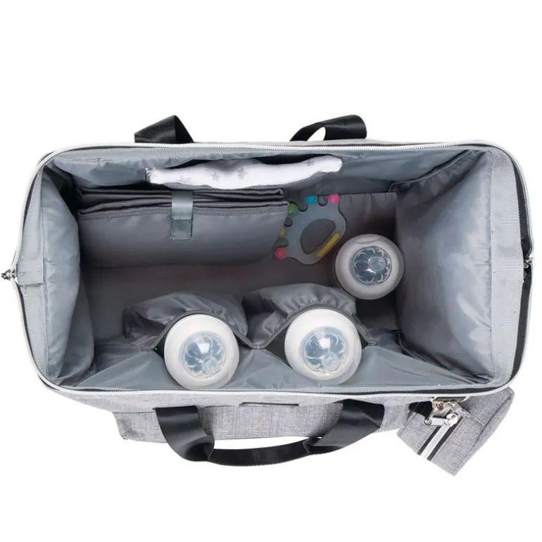 Es muy espaciosa, tiene capacidad para llevar los pañales y la ropa de muda del bebe, con 2 compartimentos para los biberones, el agua o la leche y un bolsillo externo grande.