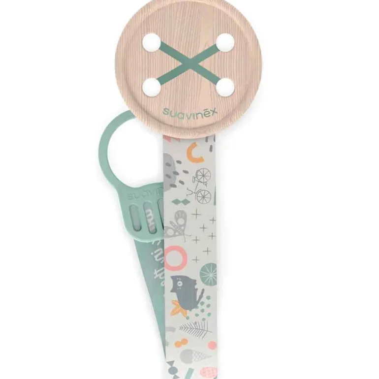 Cadena para el chupete con cinta textil y clip que permite sujetarlo suavemente a la ropa del bebe o al carro evitando que caiga al suelo y se ensucie o bien se pierda