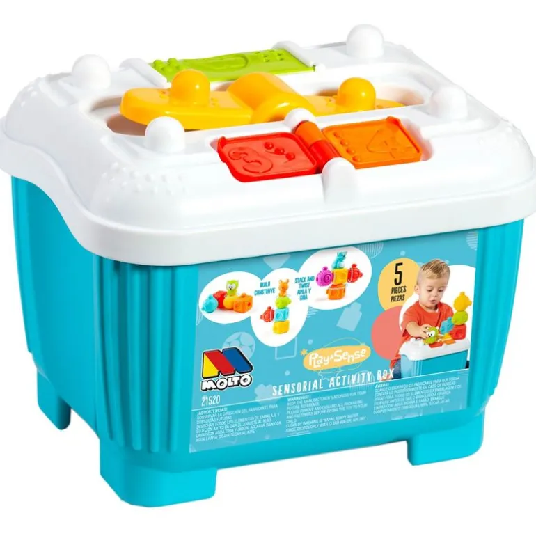 Caja de actividades sensoriales azul, con el que l@s más pequeñ@s de la casa podrán desarrollar su motricidad y coordinación. Contiene 5 bloques blanditos.