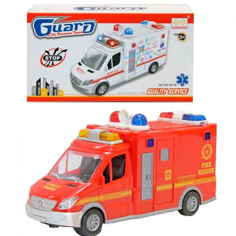 Camión de bomberos interactivo que reproduce luces y sonidos. Se mueve en diferentes direcciones. Funciona con 3 pilas AA incluidas (pilas de demostración). Recomendado a partir de 3 años.