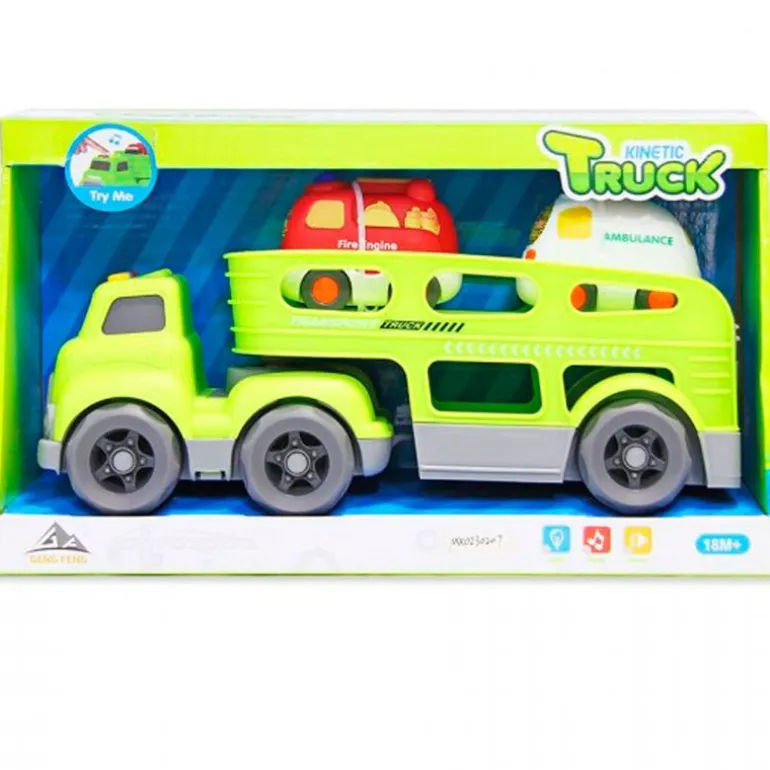 Camión de transporte con el que podrás llevar tus vehículos favoritos a todas partes. Viene acompañado de un coche de bomberos y una ambulancia. El camión reproduce sonidos y luces. Funciona con pilas incluidas (de demostración). Recomendado a partir de 18 meses.