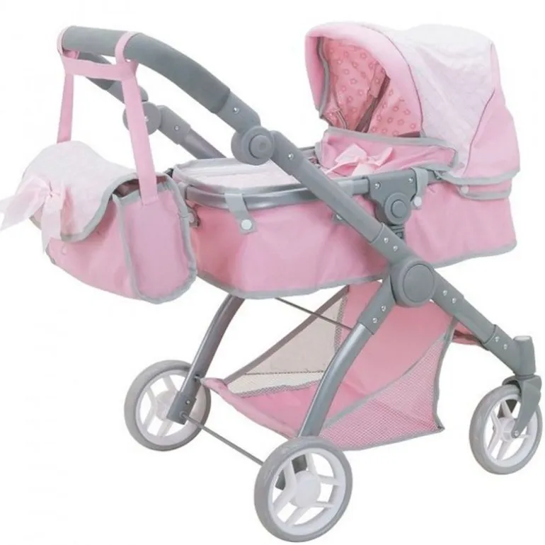 Precioso carrito para muñeca 2 en 1 en color rosa. Se convierte en silla de paseo, es acolchado, con mango regulable en altura, capota para el sol y cestilla inferior. Sus ruedas son de goma. Además, incluye un práctico bolso para poner en el carro y poder llevar todos los accesorios necesarios para el cuidado de tu muñeco bebé. Carrito plegable tipo libro. Ruedas delanteras giratorias.