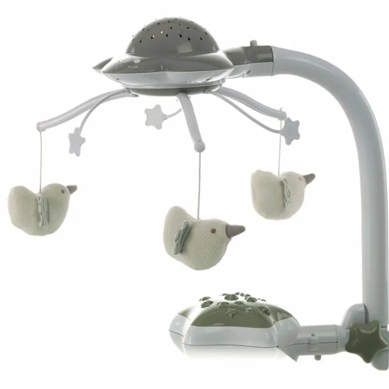 Carrusel que se adapta a todas las cunas incluso a las de viaje. Proyecta imágenes en el techo para ayudar al bebé a relajarse y conciliar el sueño gracias a sus colores suaves que cambian al ritmo de la música. Con varias melodias, lo puedes plegar para utilizarlo de proyector de mesa.