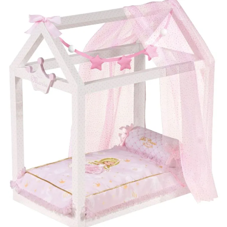 Preciosa cama en forma de casa, de la colección María de Decuevas, ideal para muñecas bebé.
