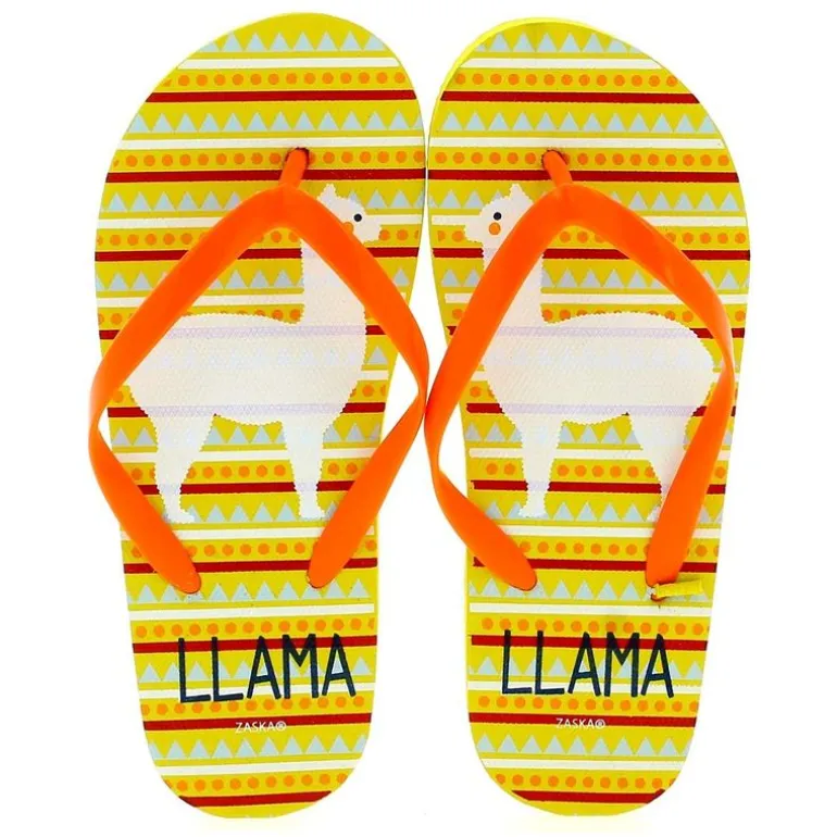 Divertidas chanclas inspiradas en el animal más simpático, la llama. Su diseño es de color amarillo con estampados, tiras naranjas y la imagen de la llama. Talla 32.