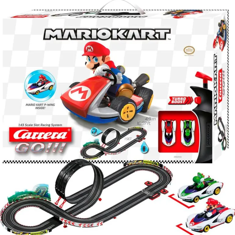 Pista GO!!! de la colección Nintendo Kart P-Wing es ahora el famoso Mario con su amigo Yoshi zumbando a través de la pista de carreras de casa ¡El héroe verde y blanco con gran nariz y zapatos naranjas ya está preparado ansiosamente en la línea de salida su señal de salida para ir a toda velocidad con los karts de escala 1:43! La pista mide 4.9 m de largo, con largas rectas, curvas y un enorme bucle. Recomendado a partir de 6 años.