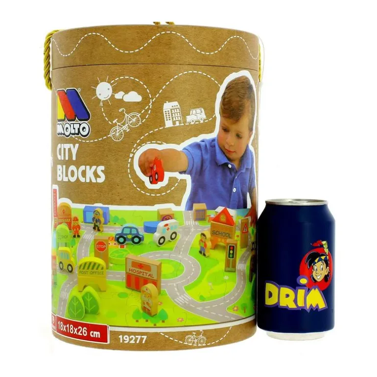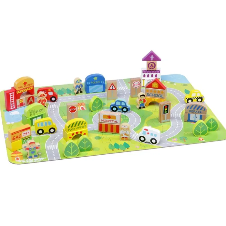 Contiene diferentes piezas fabricadas en madera, como vehículos, personajes, edificios, plantas y señales de tráfico.