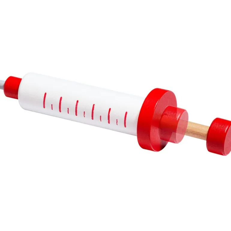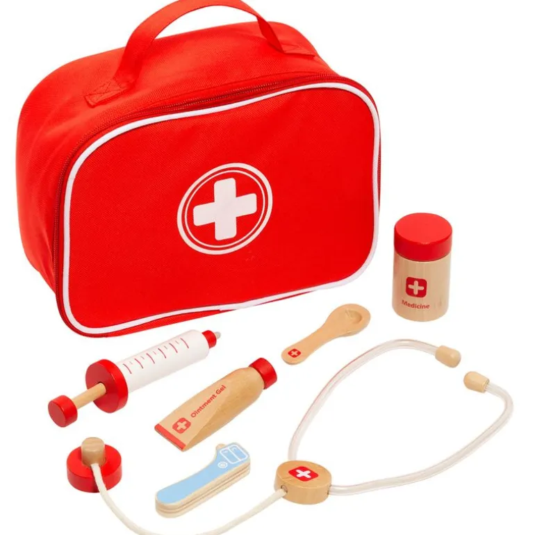 En el interior encontrarás una jeringuilla, un termómetro, un bote de medicina, una cuchara, una crema y un estetoscopio.