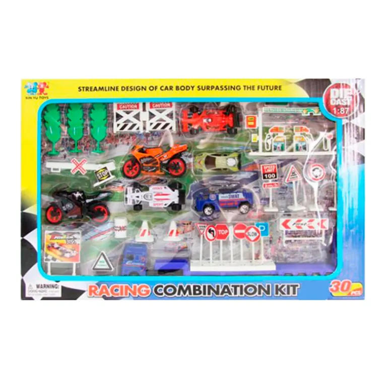 Pack de vehículos donde encontrarás hasta 30 piezas diferentes. Motos, coches, camiones, coches de carreras, señales de tráfico y muchos más complementos.