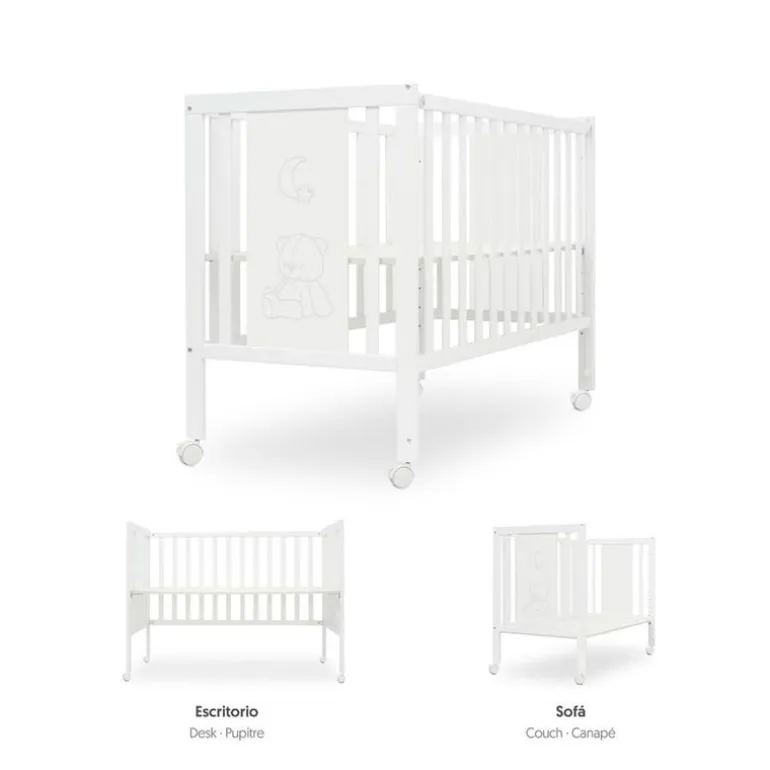 Cuna de madera de haya lacada blanca transformable, esta cuna es la solución ideal para cuando no se tiene mucho espacio o bien no quieres cargar mucho la habitación, te ofrece varias funciones; se puede usar como cuna, cama, sofá o escritorio.