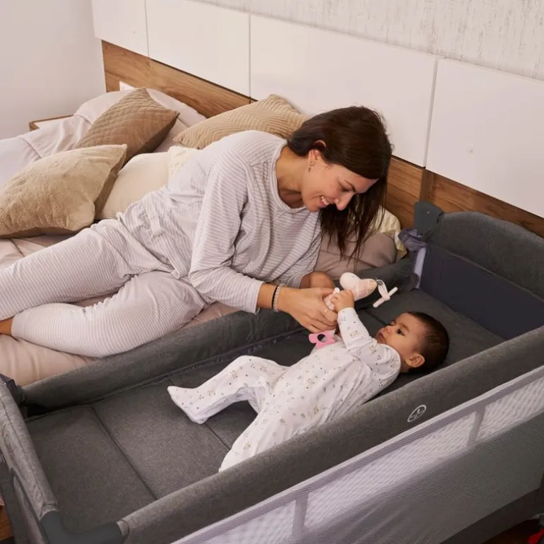 Cuna de viaje con doble altura y cambiador que dispone de la posibilidad de ser colecho, pudiendo bajar uno de los dos laterales con un novedoso sistema para poder ponerla pegada a la cama de los papás para tener al bebé cerca a la hora de dormir, de las tomas nocturnas, etc…