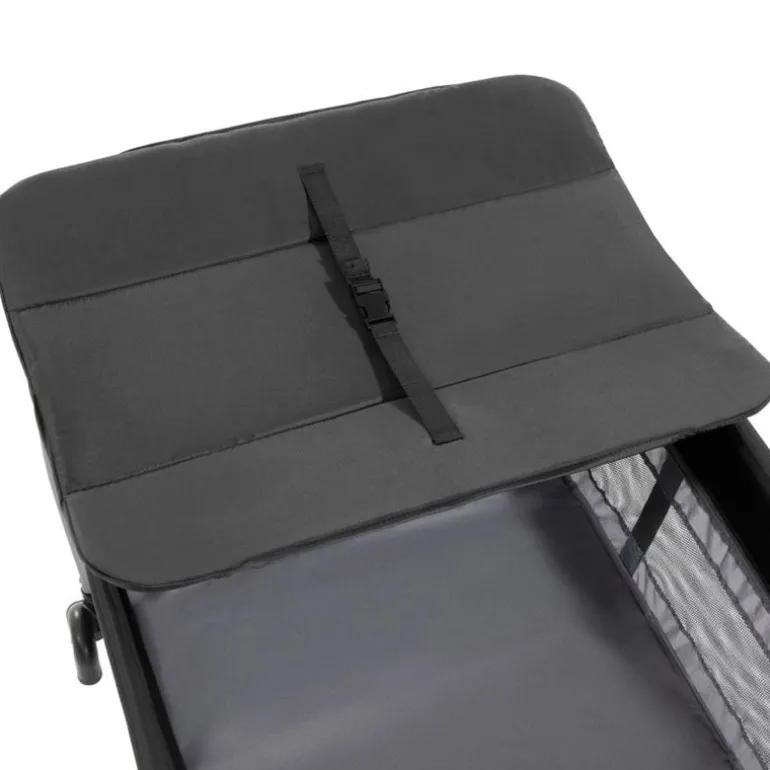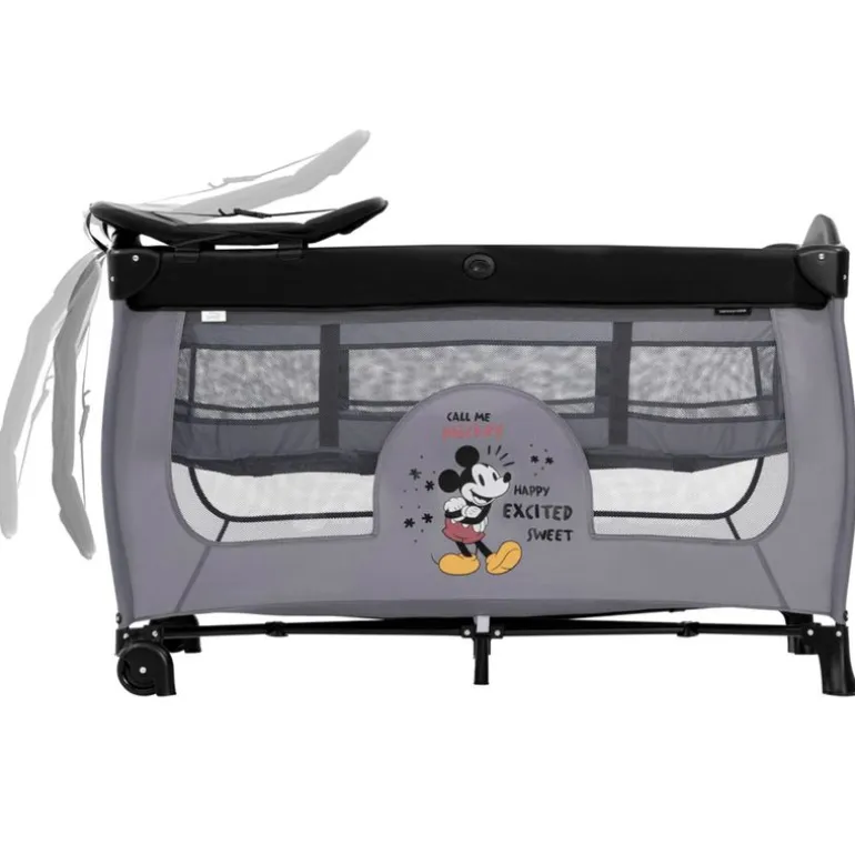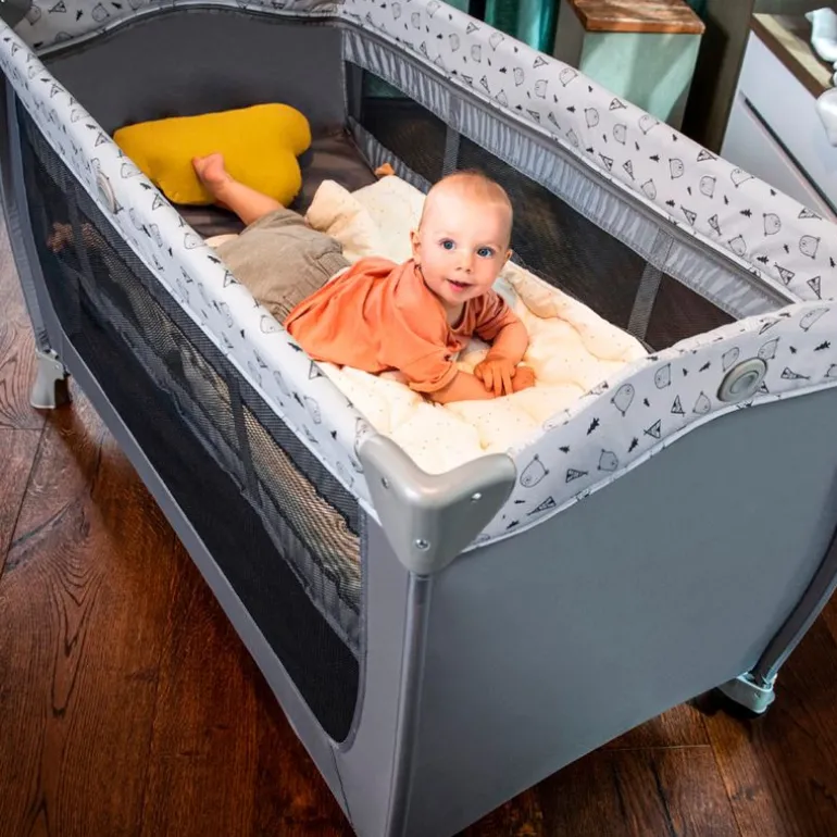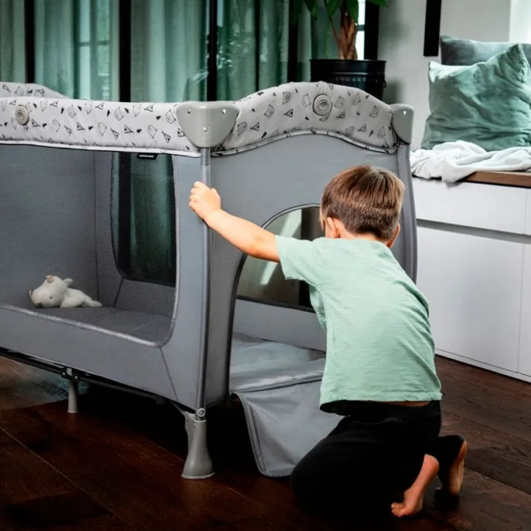 Sus laterales son de rejilla para una correcta ventilación y facilitar el contacto visual con el niño. Plegado fácil y compacto y ruedas para facilitar el traslado.