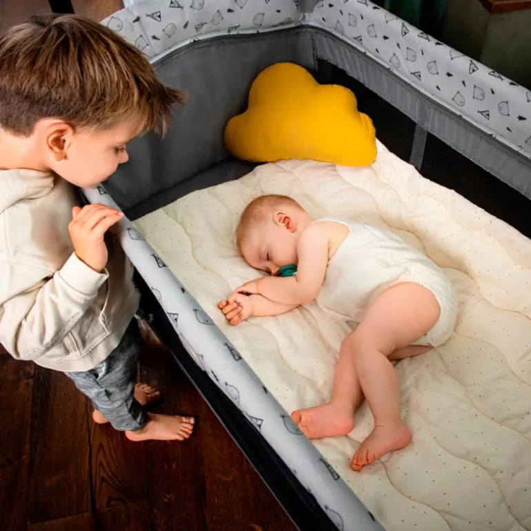 Esta cuna completa te da opción de modificar el nivel del colchón a 2 alturas diferentes: esta característica se agradece especialmente en los primeros meses para un mejor acceso al bebé. Dispone de un cambiador extraíble y en uno de los laterales, tiene una práctica gatera con cremallera para facilitar el acceso del niño cuando sea más mayor.