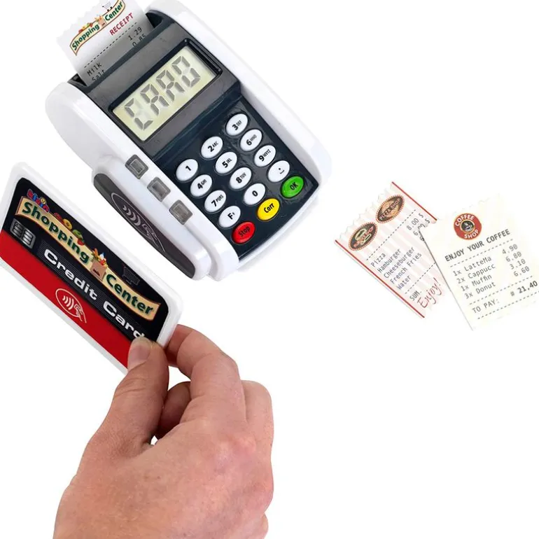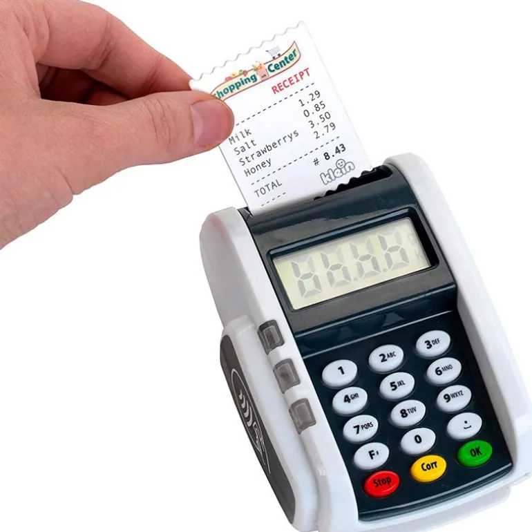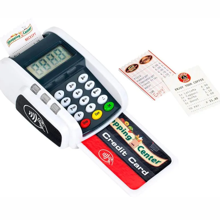 Datafono – terminal de pago ideal para que puedas completar tu supermercado infantil de la manera más moderna. Dispone de función de luz y sonido. Dispone de función de pago sin contacto “Contactless” y una ranura para tarjetas de crédito con sonido. Viene acompañado de 3 tickets de recibo y una tarjeta de crédito con función de pago sin contacto. Funciona con 2 pilas AAA NO incluidas. Recomendado a partir de 3 años.