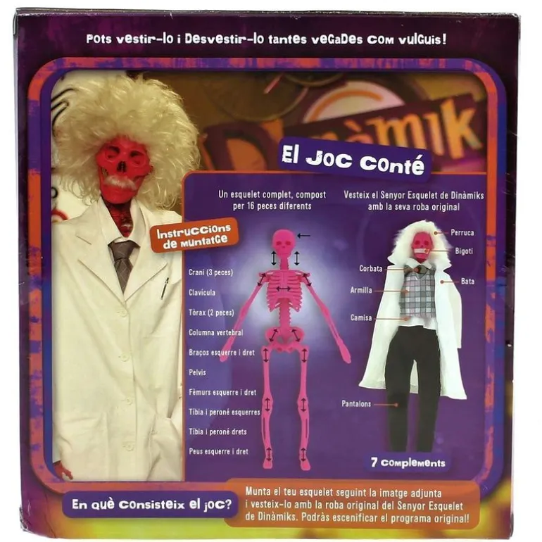 Monta tu propio esqueleto de plástico, como el que aparece en el programa de televisión Dinàmiks. En el interior encontrarás 16 huesos para comenzar a montar y 7 accesorios para que puedas vestirlo. Su tamaño es de 28 cm aproximadamente. El producto está en catalán, ya que el programa pertenece a la cadena de televisión autonómica catalana TV3. Recomendado a partir de 8 años.
