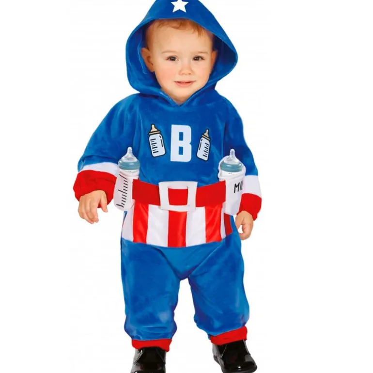Disfraz de capitán milk para los más pequeños de la casa se conviertan en grandes superhéroes. Se compone de un mono con efecto peluche, capucha y sujeta biberones. NO incluye calzado ni biberones.