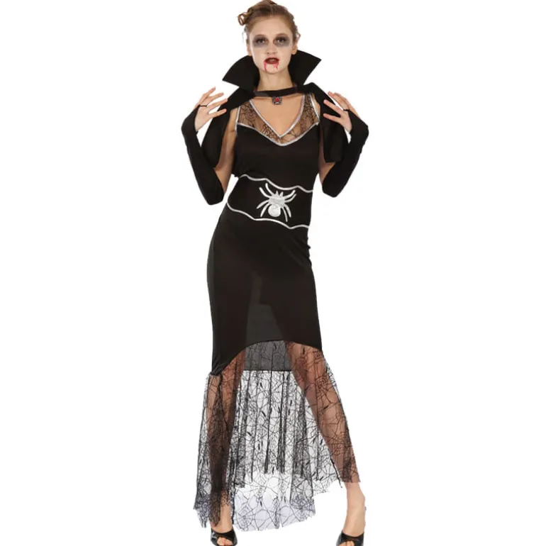 Disfraz de mujer araña compuesto por un vestido negro ajustado largo, capa con cuello, cinturón con una araña plateada y guantes/manguitos de dedo. NO incluye zapatos.