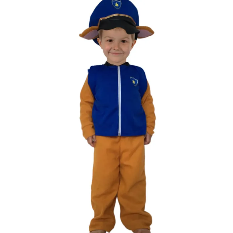Divertido mono de perro policía con gorro azul y orejas de cachorrito.