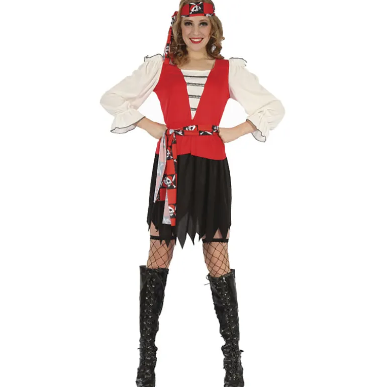 ¡Disfraz de pirata para este carnaval! Se compone de una falta con cortes de color negro y una camisa con chaleco rojo. También incluye un cinturón y un pañuelo para la cabeza a juego. NO incluye medias ni zapatos. Talla S (Talla 38) Altura 168cm, pecho 91cm, cintura 76cm, orientación aproximada.