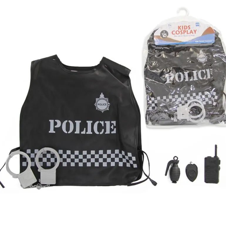En el interior de la bolsa encontrarás un chaleco de policía, unas esposas, una granada de juguete, una placa y un walkie-talkie de juguete.