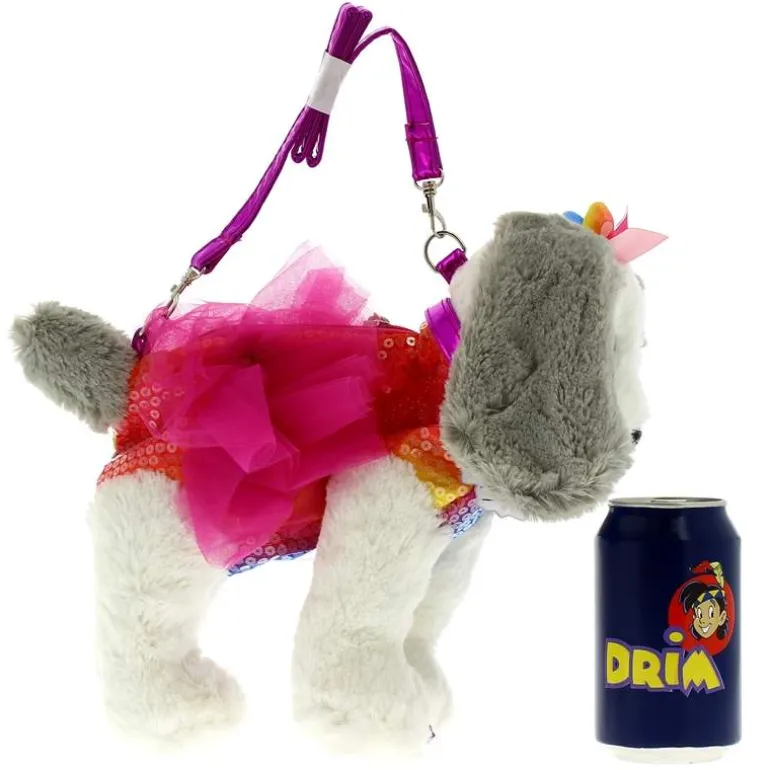 Los Doggie Star son unos bonitos perritos de peluche que también pueden usarse como bolso. ¡¡Son super divertidos y cools!! Este modelo es un mastín de color blanco, vestido con un colorido traje de lentejuelas con tu-tú lila y con 1 lacito que adorna su cabello. Gracias a la práctica asa podrás colgarte tu bolso-perrito al hombro y llevarlo contigo a todos lados.¡¡Hay más de 20 diferentes!! Colecciona todos los modelos y disfruta de un Doggie Star nuevo cada día. (Se venden por separado). Medidas aproximadas del peluche: 24 x 25 x 5 cm.