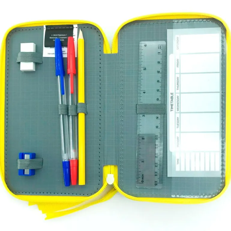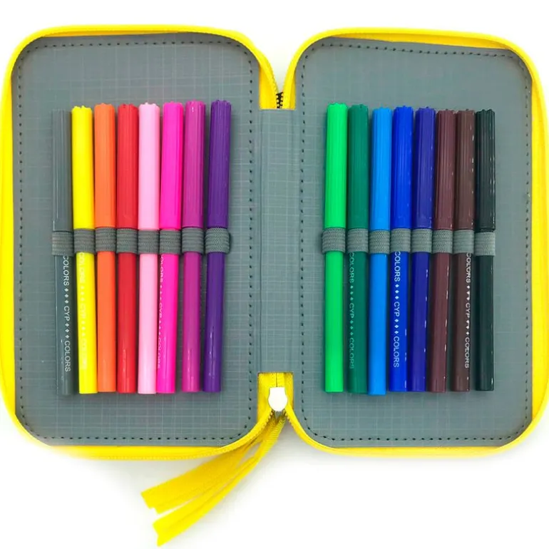 Dispone de 16 lápices de colores, 16 rotuladores de colores, 2 bolígrafos, un lápiz, una goma, un sacapuntas, una regla y un horario.