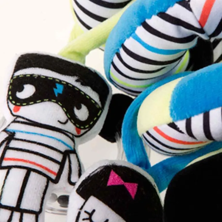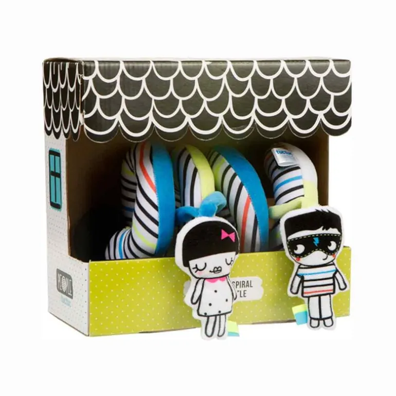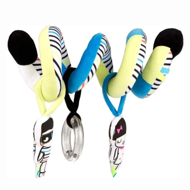 Entretenido sonajero de silla en forma de espiral, especialmente diseñado con las mascotas de la colección, para los momentos de juego en el coche de paseo.
