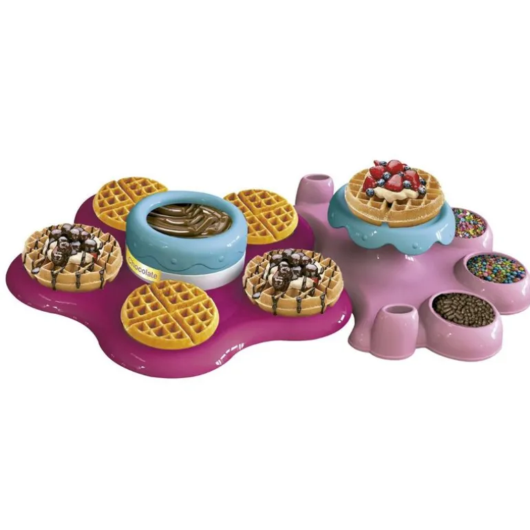 Crea y haz infinidad de gofres de diferentes sabores con este set. Prepara la masa, rellena el molde, pon la tapa y al microondas. Ponle chocolate del fundidor y a la bandeja de trabajo, decoralos como mas te guste. Los alimentos no estan incluidos. Funciona sin pilas ni electricidad. Pasaras deliciosas y divertidas horas de juego con la fabrica de gofres.