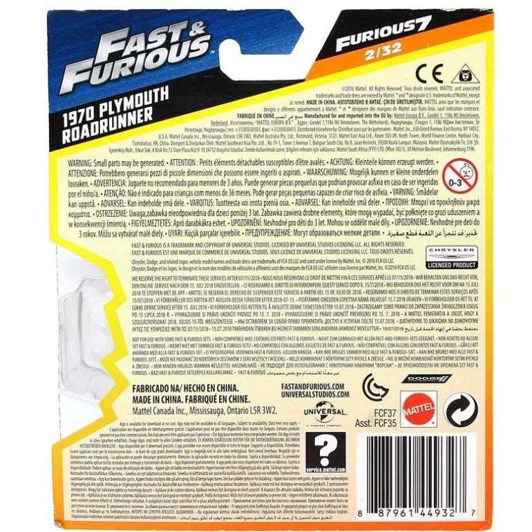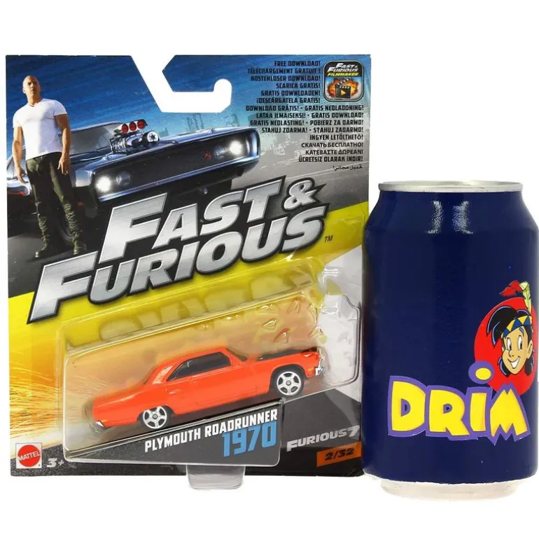 Réplica de un vehículo Plymouth Roadrunner 1970, como el que aparece en la saga de películas Fast & Furious. Está fabricado en metal y con una escala de 1:55. Recomendado a partir de 3 años.