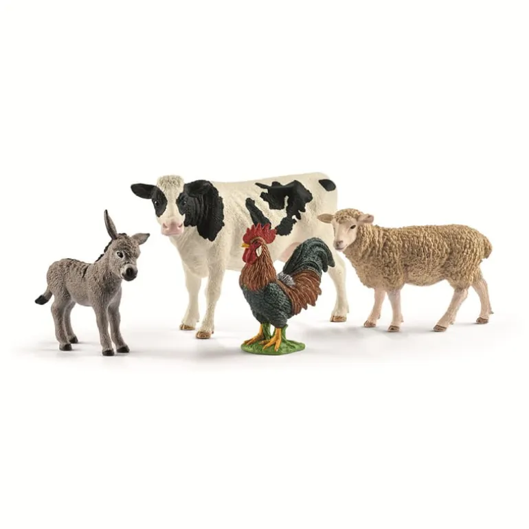 Set que incluye 4 figuras de animales de la granja de la colección Farm World de Schleich. Con este pack de iniciación los pequeños podrán recrear e imaginar divertidas historias en la granja y descubrir nuevas curiosidades sobre los animales que viven en ella. El set incluye la figura de 1 vaca, 1 oveja, 1 borriquillo y 1 gallo. Las figuras de los animales miden, aproximadamente, entre 6 y 12 cm de largo.