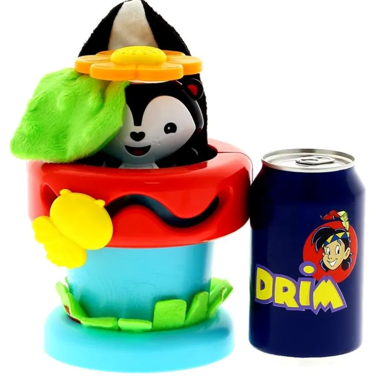En la primera etapa de juego, el niño puede apretar la mofeta para ayudarla a subir y bajar. Luego, la mofeta tentetieso se puede retirar de la maceta para activar melodías y para jugar a introducir y sacar el juguete. La suave «hierba», la cola de peluche que cruje al arrugarla y la textura de la hoja ayudan a estimular el sentido del tacto. El bichito que hay sobre la maceta gira y se desliza para estimular la motricidad fina. También estimula el olfato del niño con el aroma de vainilla de la flor. (¡Sí, huele a vainilla de verdad!).