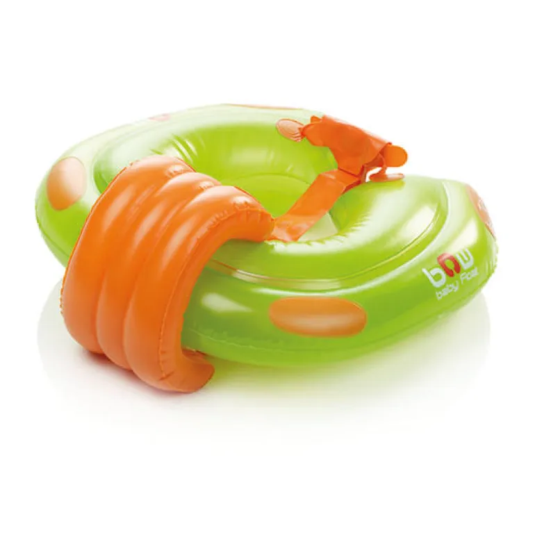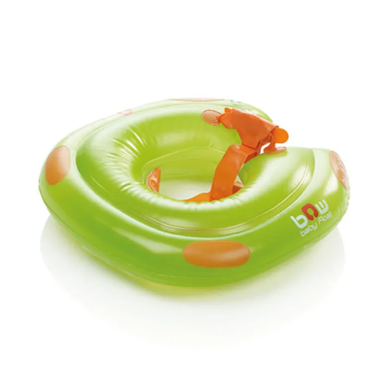 Flotador evolutivo con un arnés que evita que el niño se escurra y un reposacabezas extraíble para mayor confort.
