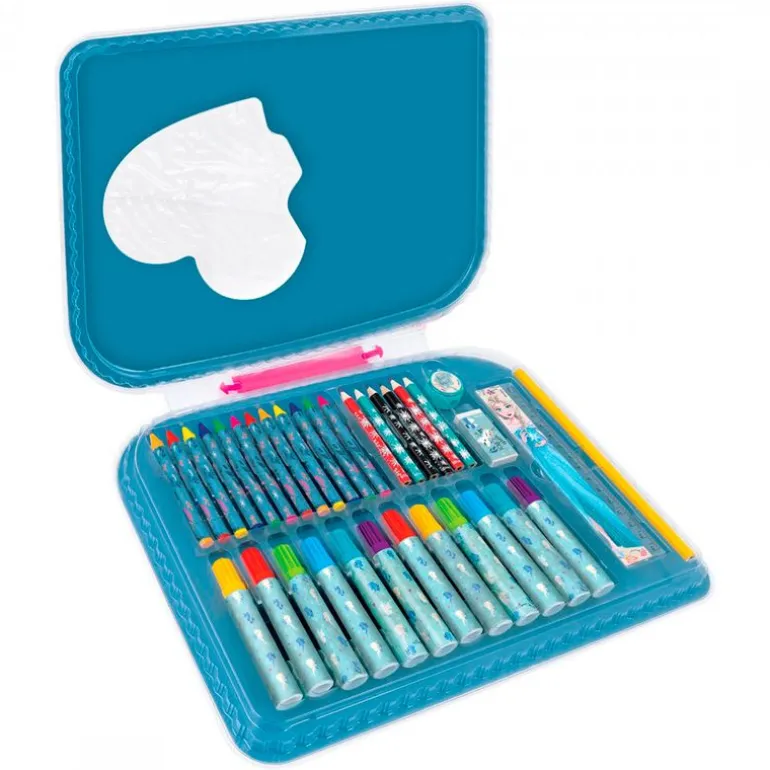 Set completo de pinturas inspirado en las películas de animación de Frozen. En el interior encontrarás 12 pinturas de cera, 12 rotuladores, 6 lápices de colores, una regla, un lápiz, una goma y un sacapuntas. Al ser un maletín, podrás llevarlo a todas partes contigo. Recomendado a partir de 3 años.