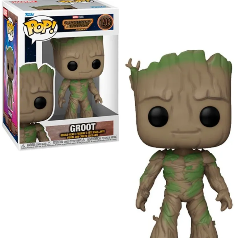 Figura fabricada en vinilo de la colección Funko POP! con número 1203, inspirado en el personaje de Groot, de la película Guardianes de la Galaxia Volumen 3. Su tamaño es de 10 cm aproximadamente. Recomendado a partir de 3 años.
