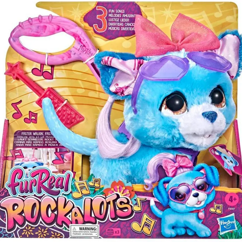 Rockalots es un adorable cachorro interactivo de la colección Furreal Friends ¡Está deseando salir a pasear contigo! Al salir a pasear reproduce 3 canciones diferentes, cuando disminuye la velocidad del paseo, las canciones también se ralentiza. Rockalots viene acompañado de un cepillo en forma de guitarra, una falda de colores y unas gafas de sol. Funciona con 3 pilas de botón incluidas (pilas de demostración). Recomendado a partir de 3 años.