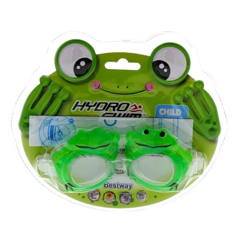 Divertidas gafas de natación para l@s más pequeñ@s. Tienen el diseño de una simpática rana verde. Están fabricadas en policarbonato con protección UV y son 100% libres de látex. Se adaptan de manera suave a la cara y disponen de una correa de silicona para ajustarlas a la cabeza. Recomendado de 3 a 6 años.