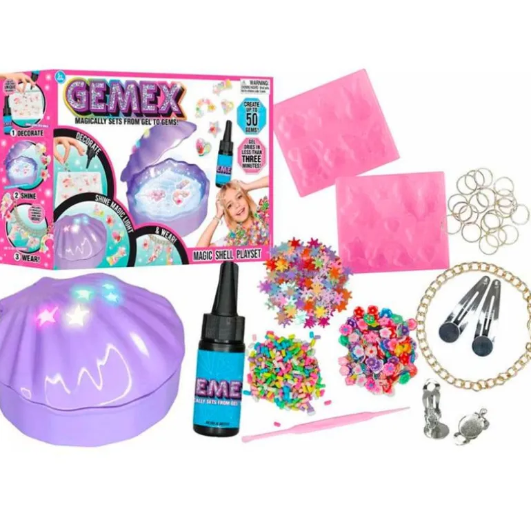 Contiene la concha mágica con temporizador de estrellas con luces, bote de 25 ml de gel mágico, 2 moldes, una pulsera de plata, 2 clips, un par de pendientes, una bolsa de anillas, 3 estilos de decoraciones diferentes y una herramienta que te permitirá mezclar.
