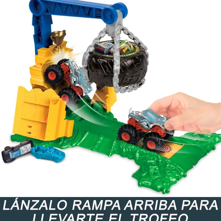Coloca coches y camiones en las gradas y cuelga la trampa del neumático para sembrar el pánico en el circuito. El pack incluye un vehículo de la colección Hot Wheels Monster Trucks de escala 1:64 y 2 coches aplastados. Lanza el vehículo y trata de escapar del neumático colgante para ganar el trofeo. Si no lo haces bien, el neumático te aplastará ¡Si consigues sobrepasar las gradas, ganarás el trofeo! Si das en el lugar correcto, romperás el neumático y liberarás los coches atrapados. Recomendado a partir de 4 años.