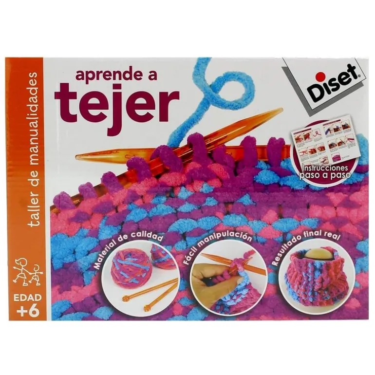 Juego educativo con todo el material necesario para aprender a tejer un cuello de lana.