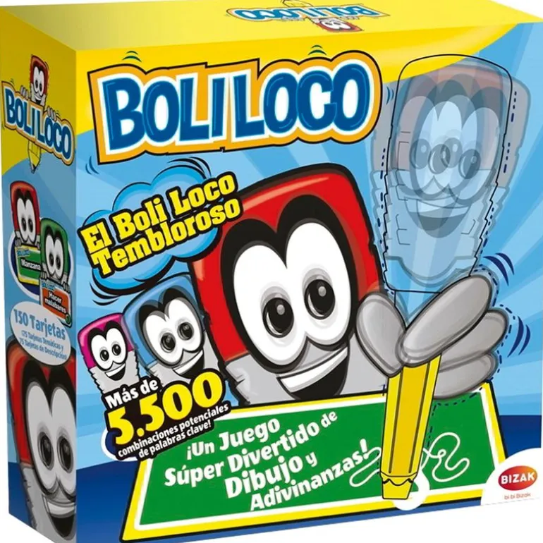 En el interior encontrarás el boli loco, un reloj de arena de un minuto, 75 cartas de descripciones, 75 cartas de nombres, 2 rotuladores borrables y 2 pizarras para dibujar.