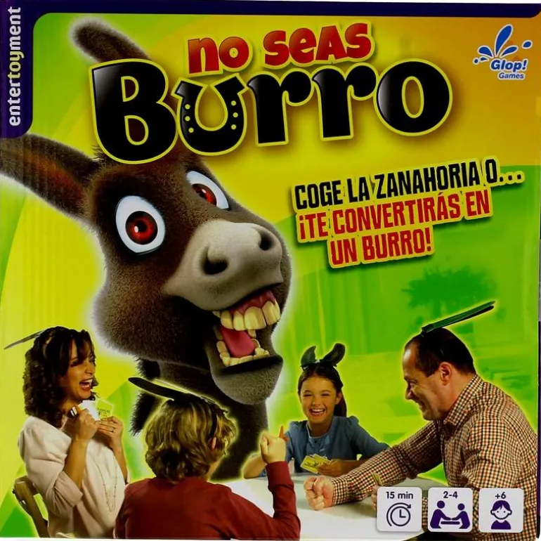 Divertido juego en el que tendrás que ser rápido adivinando y emparejando tus cartas para no ser el burro. Consigue emparejar todas tus cartas, coge rápido tu zanahoria y te librarás de ser burro. Si pierdes tres veces… ¡¡burro serás!! El juego incluye 1 orejas de burro, varias zanahorias de plástico, 1 hocico de burro y una baraja de cartas. Edad recomendada a partir de 6 años. De 2 a 4 jugadores.
